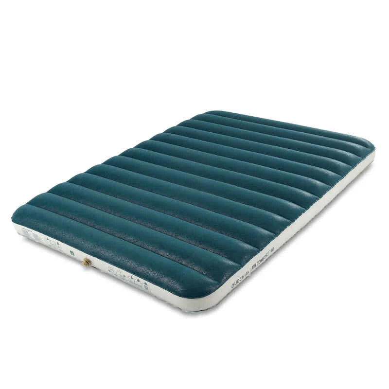 Luftmatratzen wie diese sollten idealerweise nicht zu stark aufgepumpt werden. Ein Luftdruck von 0,02 bar bzw. 0,3 PSI, bei dem man den Boden im Sitzen leicht spürt, ist ausreichend. Wenn man dann auf der Matratze liegt, passt sie sich der Körperform an und sorgt so für hohen Komfort. Wir empfehlen eine Pumpe des Typs Quechua 5,2 l rot (8243066), das effizienteste Modell unseres Sortiments.